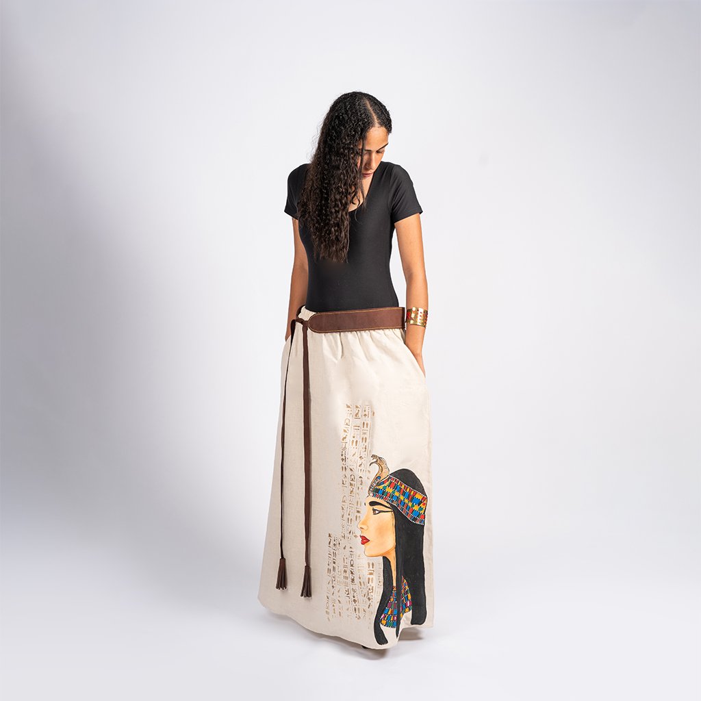 بدأت هذه الجيبة بخامة كتان طبيعي باللون البيج الهادئ، لتتحول إلى لوحة فنية تحتفي بقوة وعظمة المرأة عبر التاريخ. يتصدر التصميم رسم يدوي متقن لملكة مصرية بملامح واثقة، محاطة برموز هيروغليفية تعكس المرونة والارتباط بالجذور. كل تفصيلة في الرسم نفذت بألوان مخصصة للقماش بأيدي سيدات “سوا” في الجيزة والقاهرة، ليجسد المنتج قيمة الاتحاد في تحويل التراث إلى أزياء عصرية تمنحكِ الحرية في التعبير عن ذاتك. بفضل قصتها الانسيابية، توفر لكِ هذه الجيبة راحة واعتمادية عالية، لتكون قطعة صادقة ترافقكِ وتذكركِ دائماً بأنكِ جزء من قصة نجاح وتمكين مستمرة.