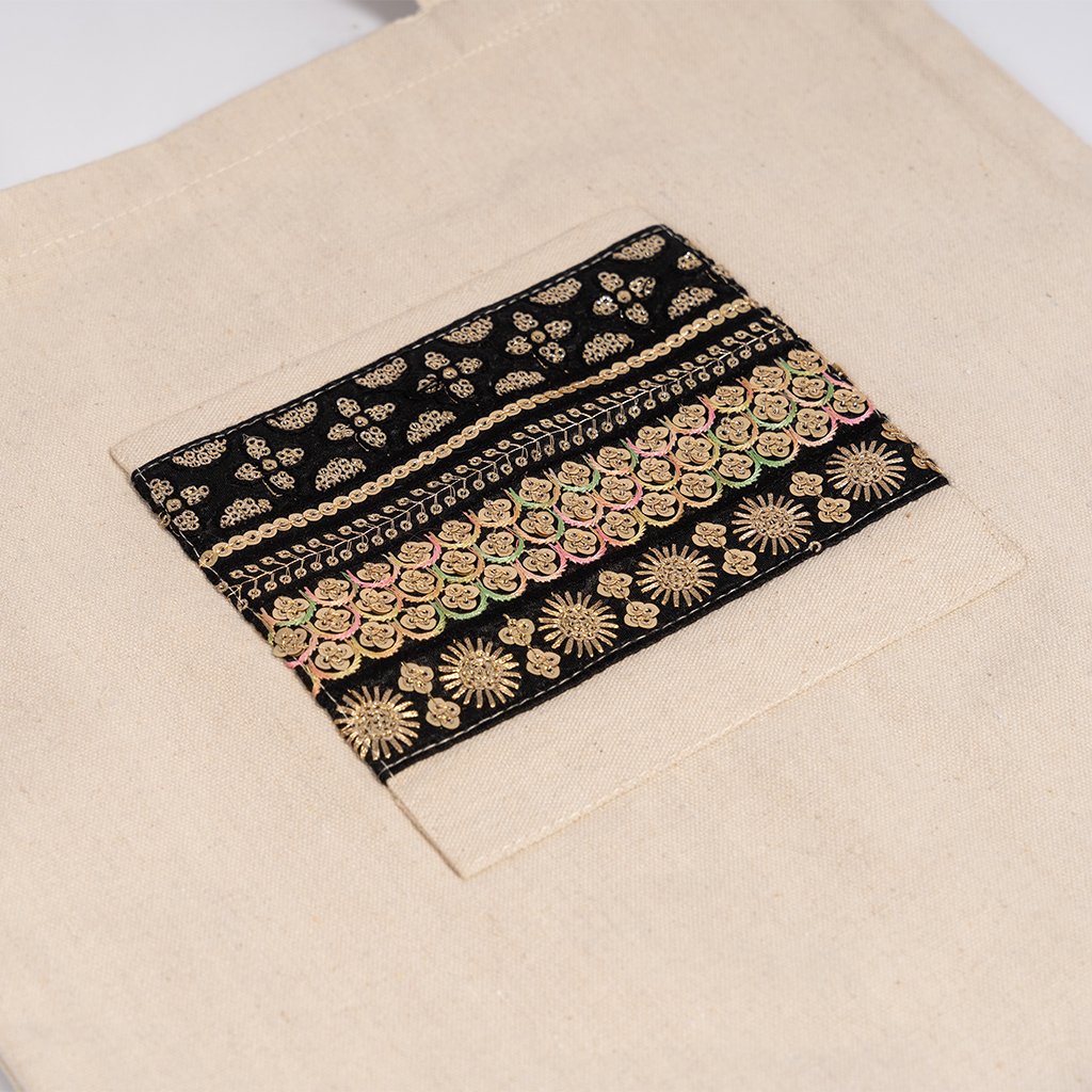 شنطة مصنوعة من قماش الدك بلون أوف وايت، تجمع بين المتانة والبساطة لتناسب الاستخدام اليومي الشاق. تعتمد فكرتها على تقنية “الباتشورك”، حيث تم دمج قطع قماشية مطرزة بنقوش هندسية وذهبية لتصبح جزءا أصيلاً من تصميم الشنطة، مما يجعل كل قطعة فريدة بتفاصيلها ولا تتكرر. صممت هذه الشنطة بمساحة واسعة ويد طويلة متينة تضمن لك الراحة والحرية في الحركة. وهي نتاج عمل يدوي دقيق لسيدات من الجيزة حولن قصاصات القماش إلى منتج مستدام، ليدعم تمكينهن ضمن رؤية “سوا”.