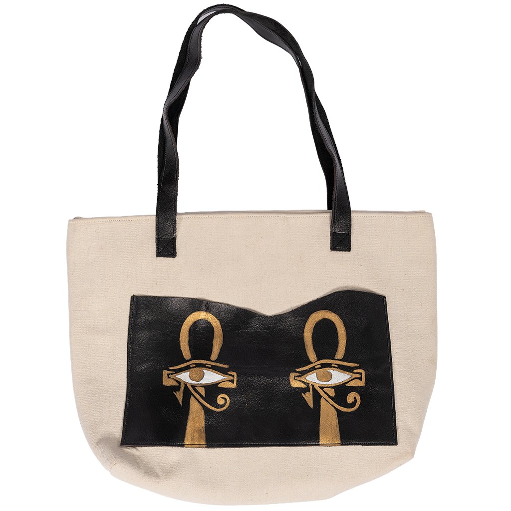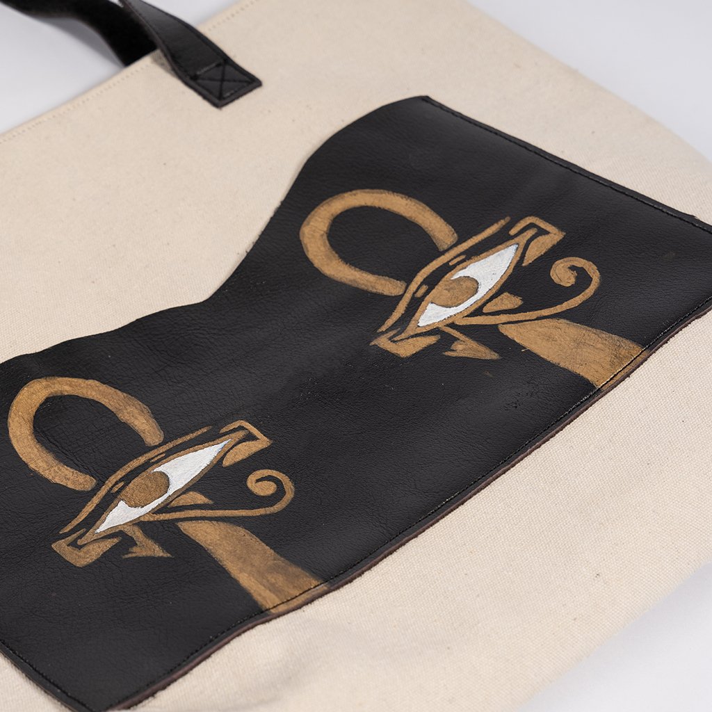 شنطة مصممة خصيصاً لتناسب احتياجات المرأة العملية، حيث تم دمج قماش الدك مع الجلد الطبيعي الأسود لتوفير حماية وأناقة في آن واحد. تتميز القطعة بواجهة جلدية مرسومة يدوياً باللون الذهبي لرموز “العنخ” وعين “حورس”، مما يمنحها طابعاً تراثياً فريداً. الشنطة مزودة بيد جلدية متينة وقوية مثبتة بعناية لتتحمل وزن اللابتوب والأغراض اليومية، وهي نتاج عمل يدوياً لسيدات من الجيزة والقاهرة، وهو دمج فني يخدم أهداف التمكين في “سوا”.