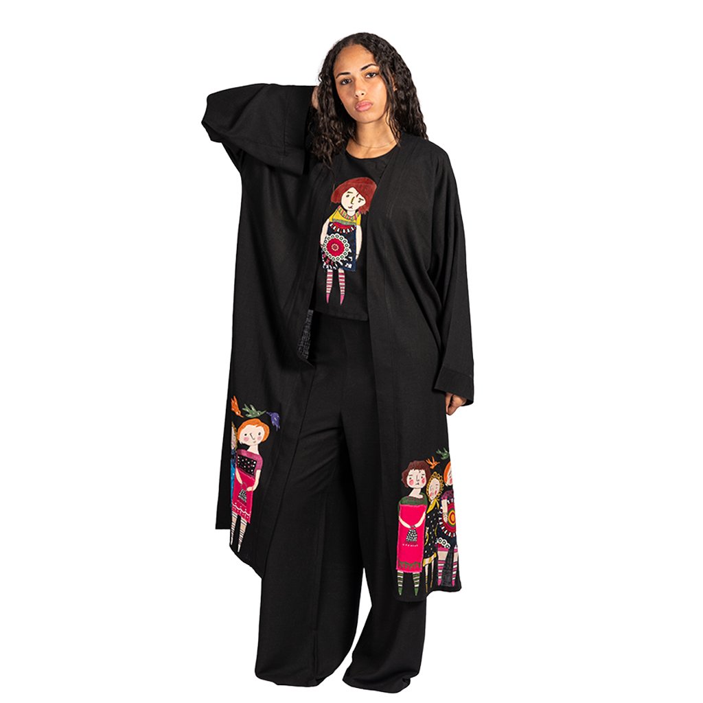 طقم (سوت) من الكتان الفاخر مكون من 3 قطع، يتميز برسومات يدويا لشخصيات فريدة. تصميم يجمع بين الحضور القوي والفن المعاصر، ونمشي به “سوا”.
