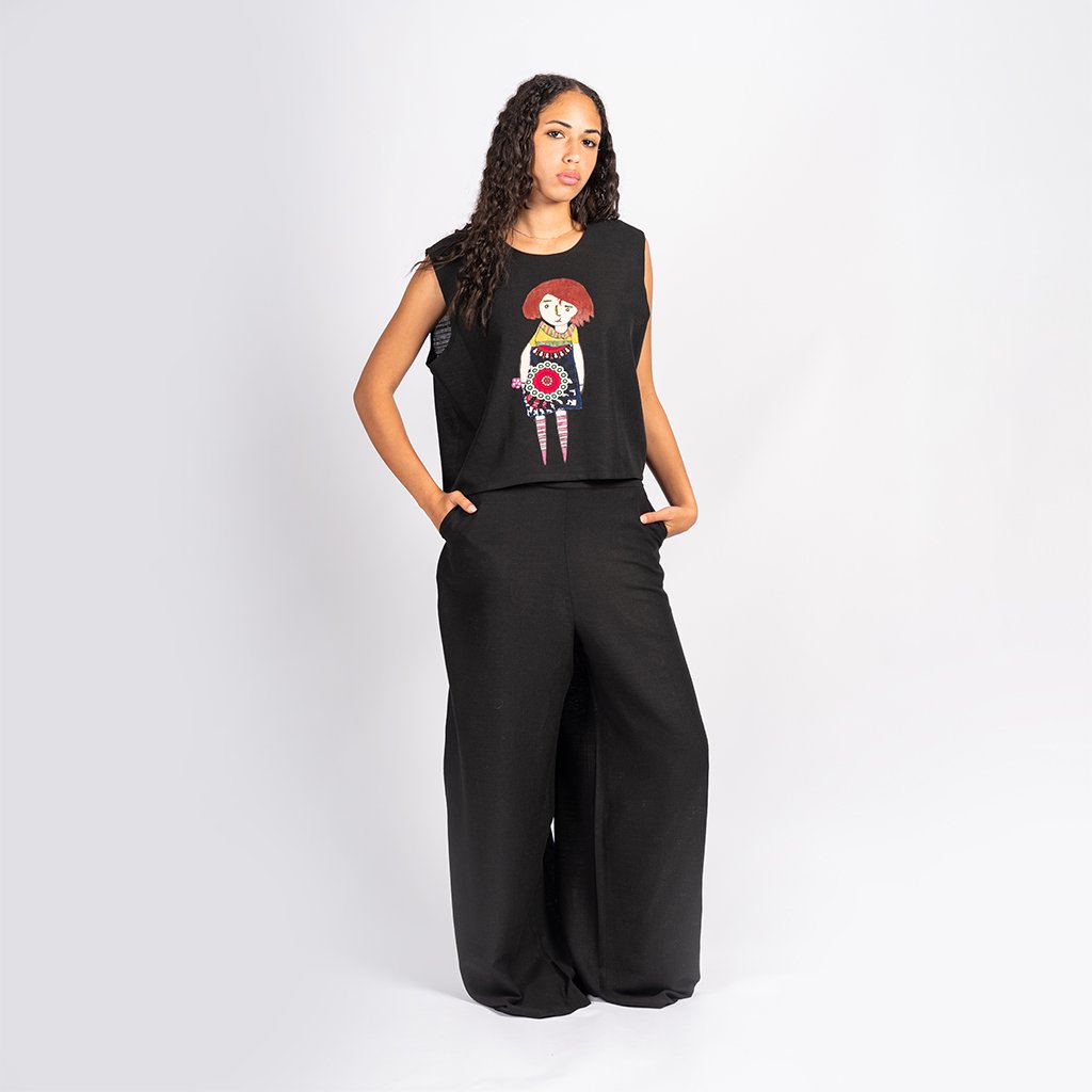 عبري عن حضورك المتفرد مع طقم “عالية” المصنوع من أجود أنواع الكتان بلونه الأسود الملكي. تبرز قوة هذا التصميم في الرسومات اليدوية الواضحة والمبهجة التي تزين الكارديجان والتوب، وهي شخصيات فنية رسمت يدويا بألوان مفعمة بالحياة لتمنحك إطلالة جريئة لا تنسى. يتكون الطقم من بنطلون واسع ومريح، توب بدون أكمام، وكارديجان طويل يمنحك طابعا من الفخامة والتميز. صنت هذه القطعة بمهارة يدويا في الجيزة والقاهرة، لتقدم لك فنا يواكب الشخصية الواثقة والمحبة للاختلاف ضمن رؤية “سوا”.